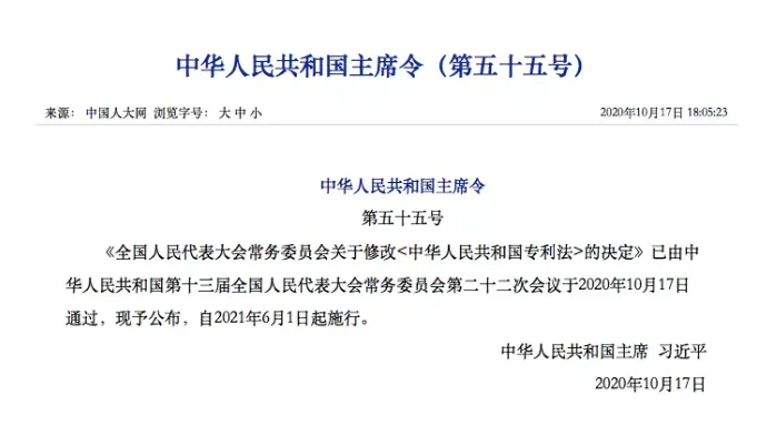 2020年10月17日第十三届全国人民代表大会常务委员会第二十二次会议通过修改 《中华人民共和国专利法》的决定。